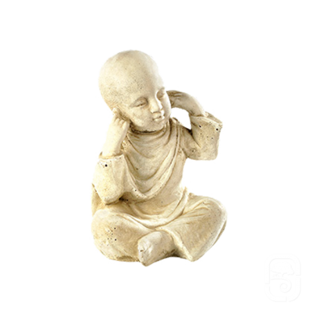 Cette statuette en pierre reconstituée représente un enfant moine se bouchant les oreilles, faisant référence au célèbre symbole asiatique des singes de la sagesse. Associée aux deux autres figurines, elle illustre la maxime ancestrale ne rien voir, ne rien entendre, ne rien dire, transmise depuis plus de 2500 ans à travers le monde.